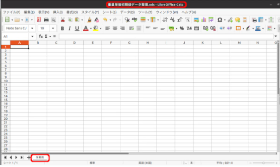 このブックの名前は「重量単価初期値データ整理.ods」で、そのブックにあるワークシートは「作業用」という名前のもの1つのみとします。マクロのプログラムをこのブック内に作成していきます。