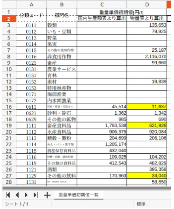 C列が国内生産額表より算出した重量単価[初期値]、D列が物量表より算出した重量単価[初期値]になります。